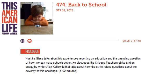 Host Ira Glass talks about his experiences reporting on education and the unending question of how we can make schools better. He discusses the Chicago Teachers strike and an essay by writer Alex Kotlowitz that talks about how the strike raises questions about the severity of this challenge.